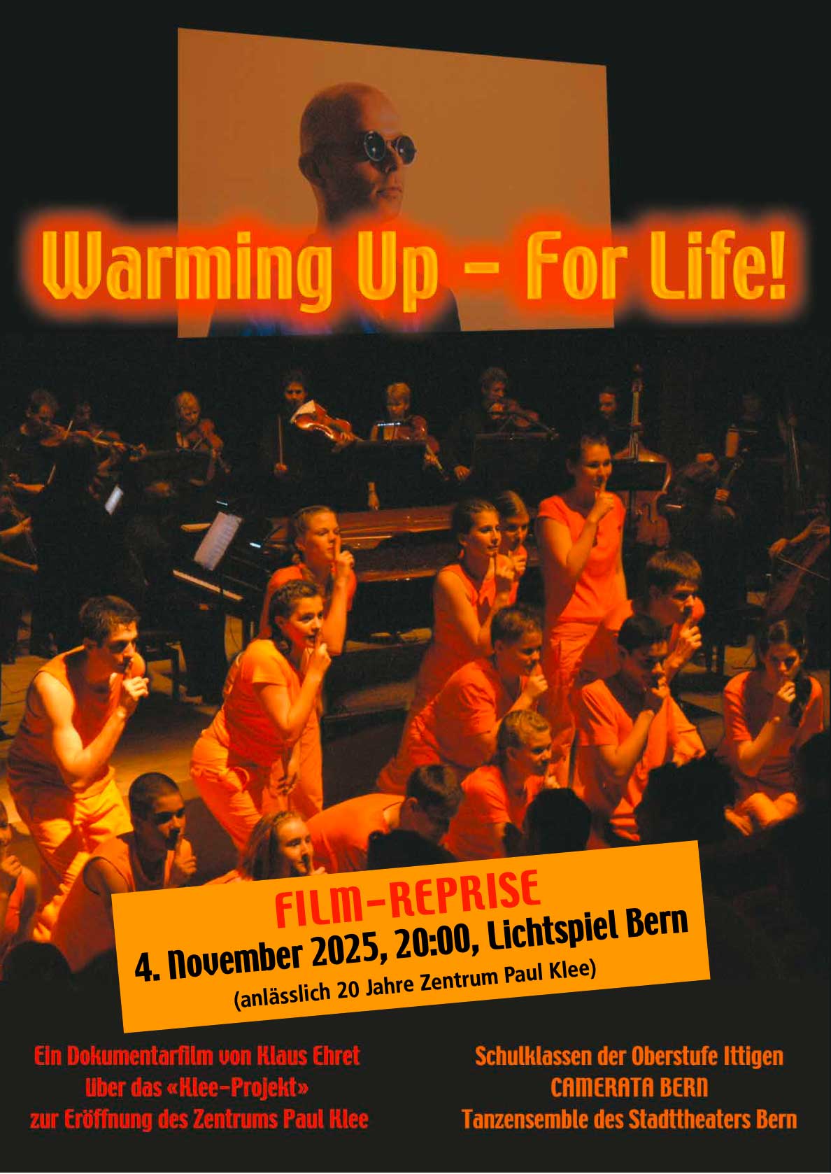 Anlässlich des Jubiläums des Zentrums Paul Klee 2025 zeigt Ciné Bern den Dokumentarfilm «Warming Up – For life!» Wir freuen uns sehr, 20 Jahre später, ehemalige Mitwirkende Schülerinnen und Schüler, Tänzerinnen und Tänzer, Musikerinnen und Musiker an dieser Reprise im Lichtspiel Bern begrüssen zu können.